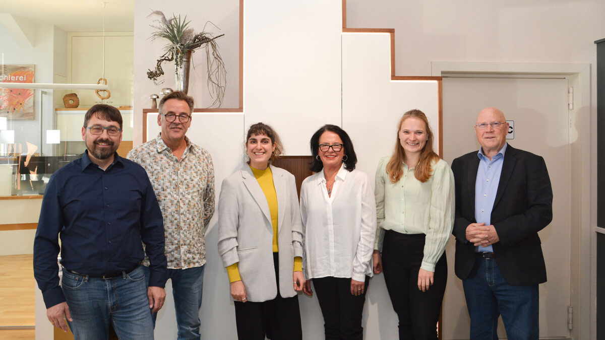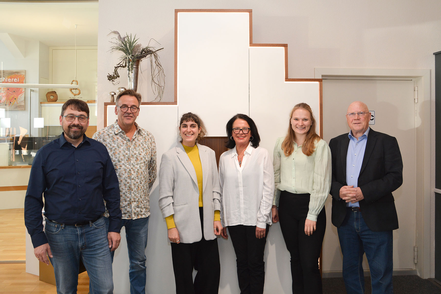 Extravagante Schrankwände und andere Möbel sind ihre Spezialität: Neu-Inhaber Marco Schmidt (links) und Firmengründer Frank Bösche (daneben) freuten sich über den Besuch der Delegation mit (weiter von links) Marie Kollenrott (MdL der Grünen), TIW-Geschäftsführerin Carola Weitner-Kehl, Tamina Reinecke (MdL der Grünen) sowie Prof. Dr. Wolf-Rüdiger Umbach, Vereinsvorsitzender des TIW.Foto: Regio-Press