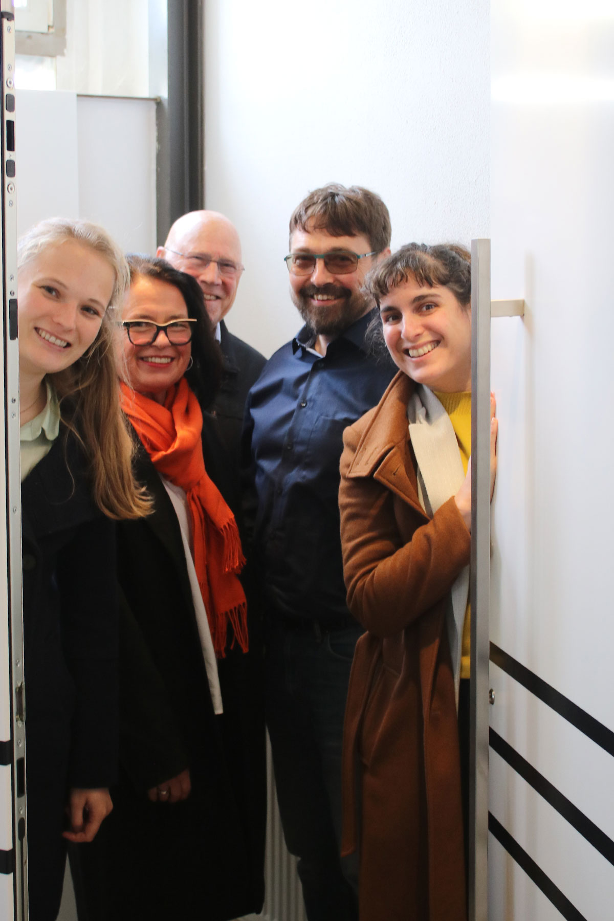Extravagante Schrankwände und andere Möbel sind ihre Spezialität: Neu-Inhaber Marco Schmidt (links) und Firmengründer Frank Bösche (daneben) freuten sich über den Besuch der Delegation mit (weiter von links) Marie Kollenrott (MdL der Grünen), TIW-Geschäftsführerin Carola Weitner-Kehl, Tamina Reinecke (MdL der Grünen) sowie Prof. Dr. Wolf-Rüdiger Umbach, Vereinsvorsitzender des TIW.Foto: Regio-Press